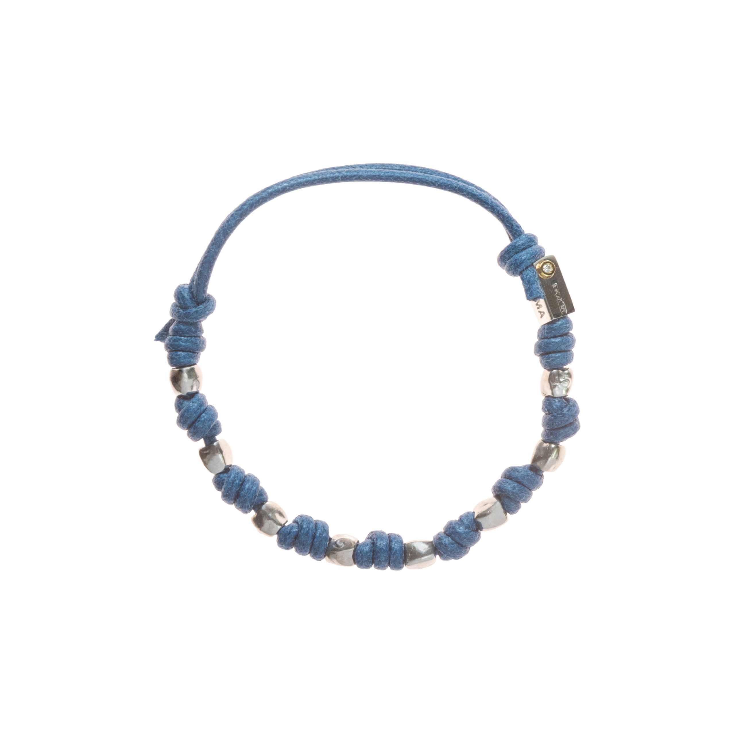 Bracciale in cotone con castone in oro 750 millesimi e diamante kt.0,1 ed 8 sassi in argento 925 millesimi