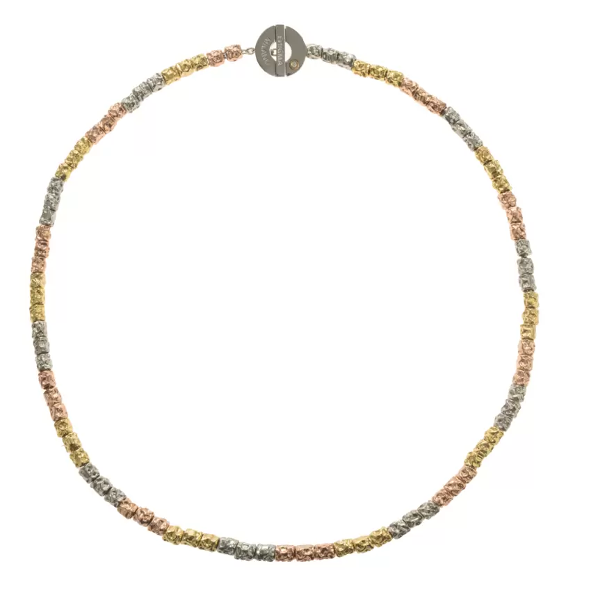 Una sequenza dinamica di 88 dadini in argento declinati nei toni bianco, giallo e rosé. Un design ricco e contemporaneo, pensato per chi cerca un tocco di colore con stile essenziale.